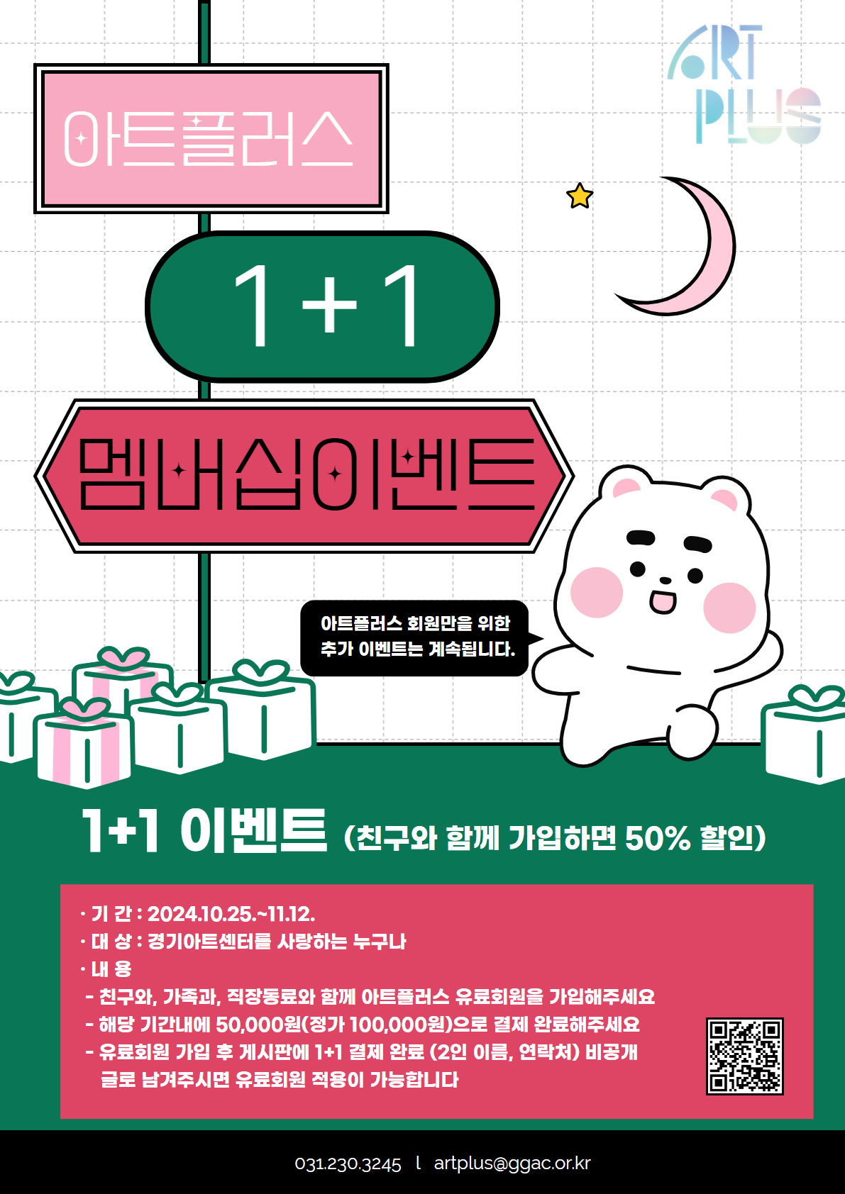 회원 공지사항 유료회원 가입 아트플러스 티켓신청 1:1 문의 아트플러스 1+1 이벤트 안내 아트플러스 관리자 2024-10-24 16:09 (수정일: 2025-12-04 12:36) 조회수 2,013 아트플러스 특별 이벤트 및 1+1 이벤트 연장 안내 목록 사전모집 신청자 회원 공지