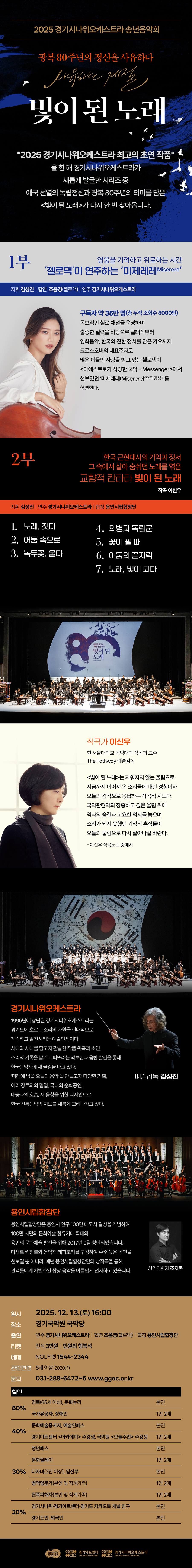 일정별 공연장별 예술단별 월간일정 예술단공연 경기시나위오케스트라 송년음악회 <사유하는 계절 : 빛이 된 노래> - 용인 일자 2025-12-13 (토) ~ 2025-12-13 (토) 시간 2025-12-13 16:00 (공연시간: 70분) 장소 국악당(용인) 주최/주관 (재)경기아트센터 / (재)경기아트센터 관람연령 5세 이상 문의 031-289-6472~5 공유 공유하기 티켓가격 전석 30,000원, 만원의 행복석 예매하기 상세정보 티켓정보 유의사항 리뷰 상세정보 티켓정보 유의사항 리뷰 아직 작성된 리뷰가 없습니다. 첫 리뷰 글을 작성해 보세요. 목록보기