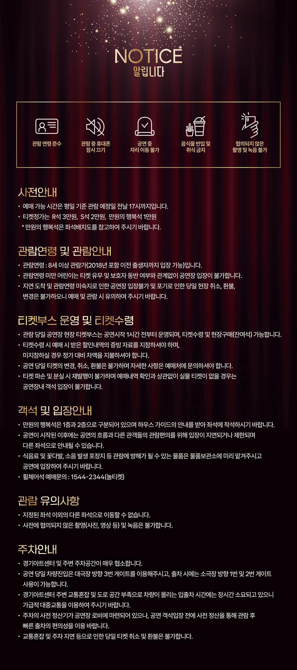 일정별 공연장별 예술단별 월간일정 예술단공연 경기도극단 뮤지컬<명랑가족> 일자 2025-12-12 (금) ~ 2025-12-14 (일) 시간 2025-12-12 00:00 더보기 2025-12-13 00:00 2025-12-14 00:00 장소 소극장 주최/주관 경기아트센터 / 경기도극단 관람연령 8세이상 문의 031-230-3317 공유 공유하기 티켓가격 1층 R석 30,000 / 2층 S석 20,000 예매하기 상세정보 티켓정보 유의사항 리뷰 상세정보 티켓정보 유의사항 리뷰 아직 작성된 리뷰가 없습니다. 첫 리뷰 글을 작성해 보세요. 목록보기