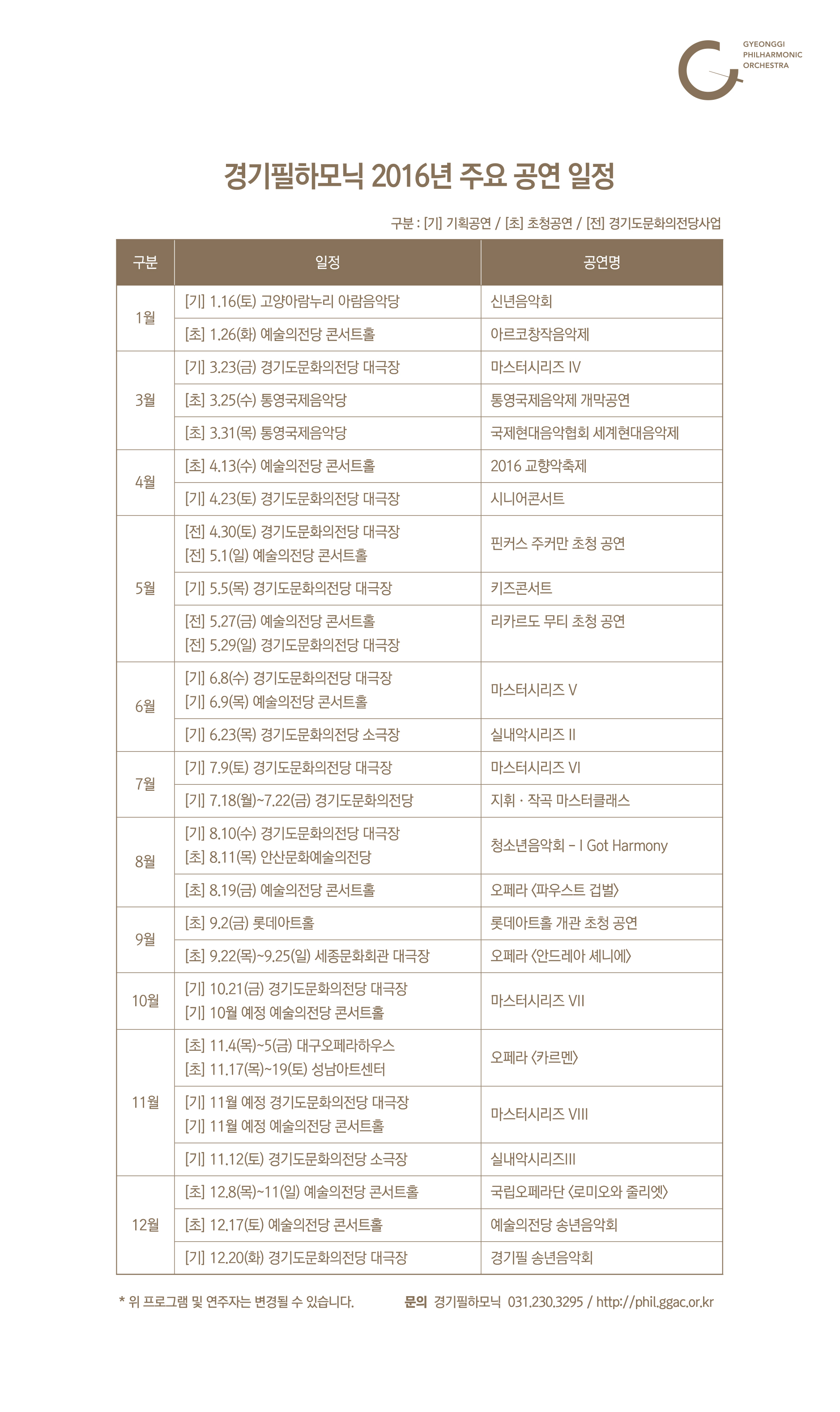기관소식 사업공고 입찰공고 보도자료 예술과만남 경기소식 경기필하모닉 2016 시즌 공연일정 안내 경기필 2016-01-21 00:00 (수정일: 2016-01-21 14:31) 조회수 3,556 2016년 경기도문화의전당 문화예술기관 연수단원 모집 목록 경기도문화의전당 경기팝스앙상블 사무/악기스텝 보조인력 모집