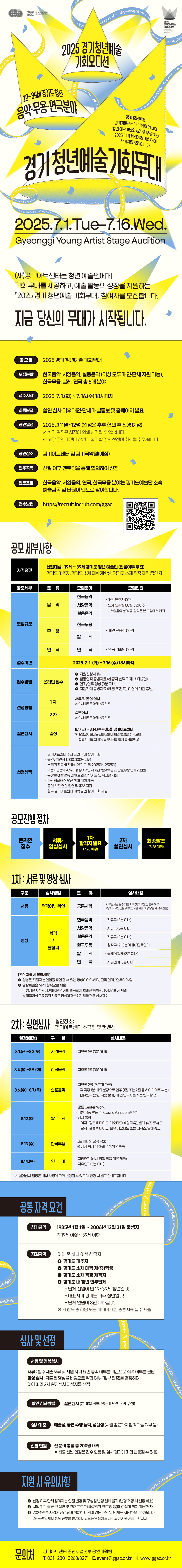 경기아트센터 사업공고 제2025–010호2025 경기 청년예술 기회무대 참여자 모집(재)경기아트센터에서는 청년 예술인에게 기회 무대를 제공하고, 예술 활동의 성장을 지원하는 2025 청년예술 기회무대 참여자를 모집합니다.