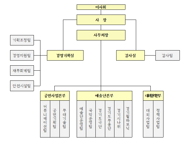 우선 경기아트센터의 경영파트와 사업파트를 명확히 구분해 정책결정을 간결하게 만들었다. 또한 신속한 업무처리를 위해 경영기획실(구, 경영본부)이 사장직속실로 직제가 변동되었다.