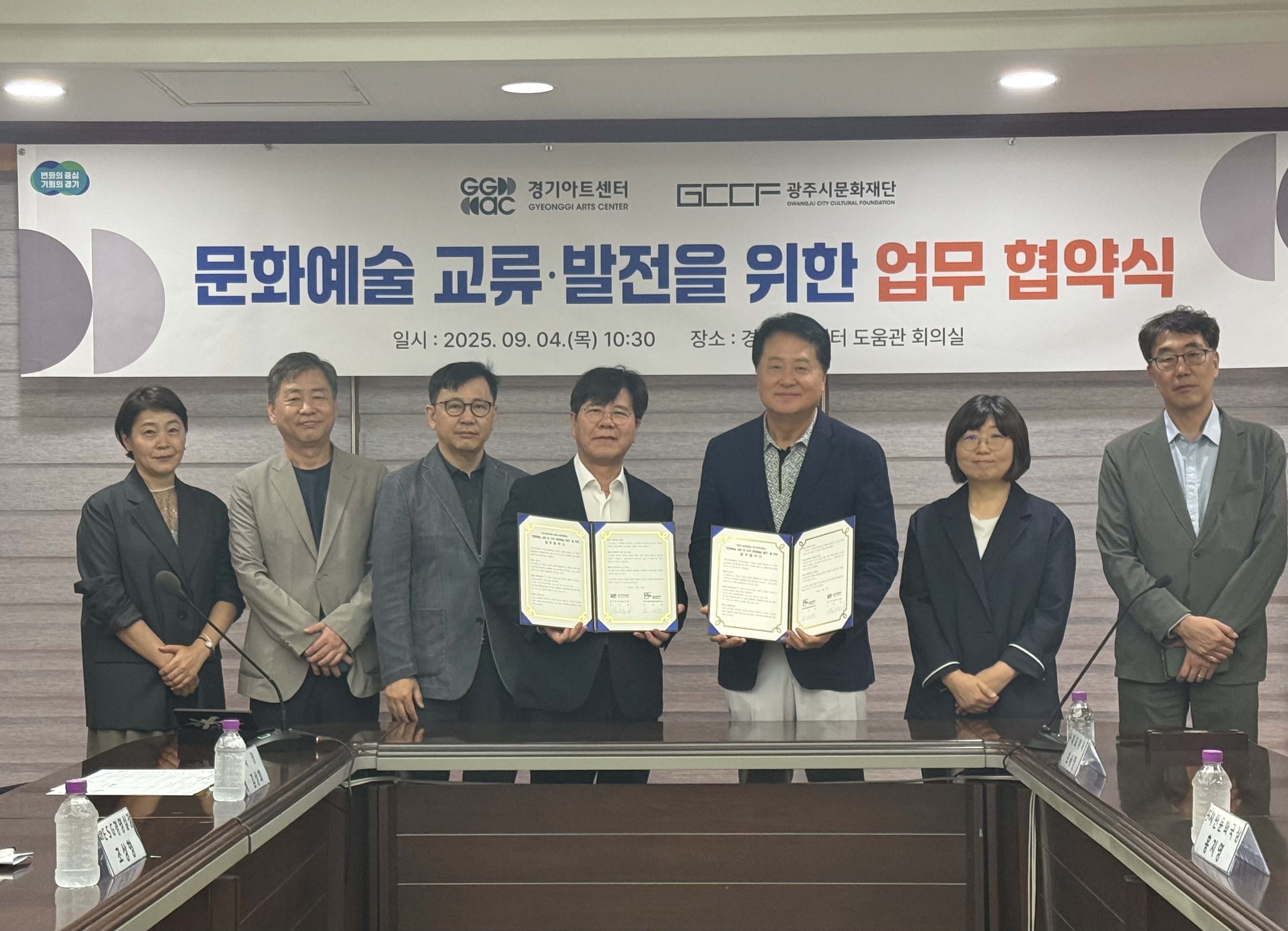 경기아트센터(사장 김상회)가 9월 4일(목) 경기아트센터 회의실에서 광주시문화재단(대표이사 오세영)과 우수 문화예술 콘텐츠의 안정적 유통망 구축, 지역 공연장 경쟁력 강화를 목적으로 한 업무협약을 체결했다. 협약식은 경기아트센터 김상회 사장, 광주시문화재단 오세영 대표이사 등 양 기관의 관계자들이 참석한 가운데 진행되었다.