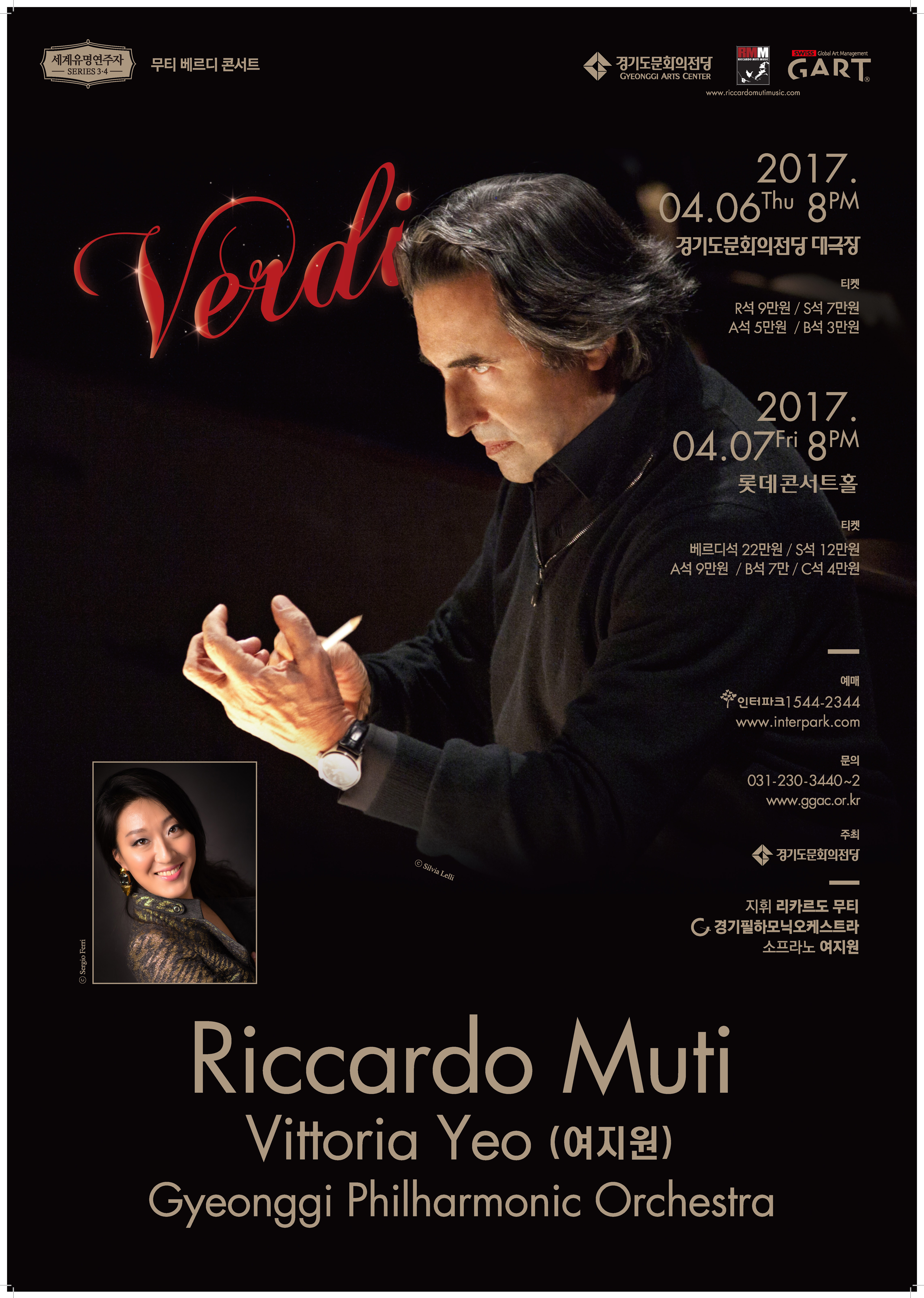 - 경기도문화의전당(사장 정재훈)이 세계유명연주자 시리즈 두 번째 무대로‘무티 베르디 콘서트’를 4월 6일(목) 오후 8시 경기도문화의전당 대극장과 7일(금) 오후 8시 롯데콘서트홀에 올린다. 이름만 들어도 콘서트 고어들을 설레게 하는 세계적 거장‘리카르도 무티’. 그가 자신의 주요 레퍼토리인 베르디 음악을 들고 관객과 만난다. 우리나라‘베르디 오페라’ 역사상 놓칠 수 없는 순간으로 기록 될 이번 콘서트에 많은 이들의 이목이 일찌감치 집중됐다.