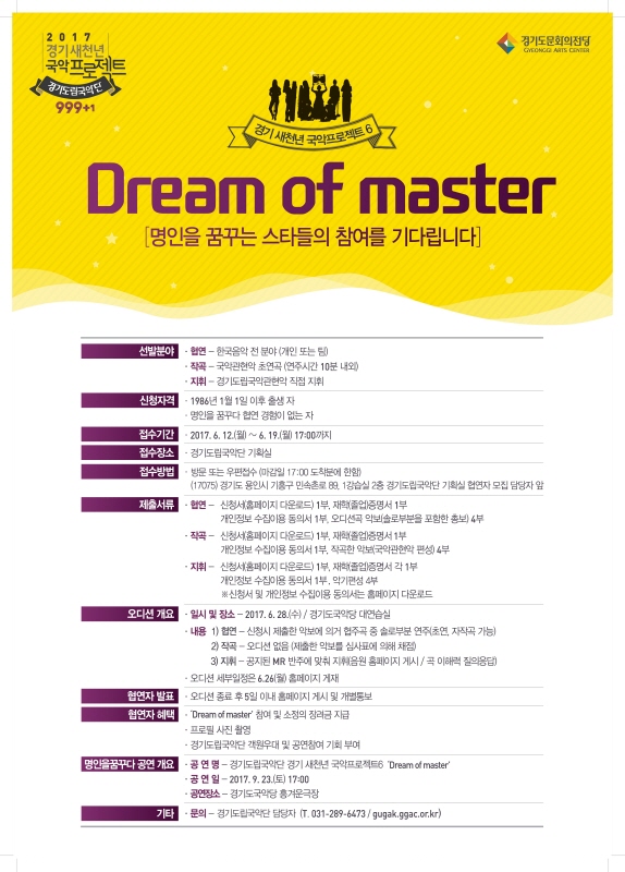 경기도립국악단은 그간 <명인을 꿈꾸다>를 통해 역량 있는 국악인들을 발굴해왔다. 올해 16회째를 맞이한 <명인을 꿈꾸다>는 보다 젊고 역동적인 차세대 주역들을 적극적으로 선발하고, 모집 분야를 확대하여 수혜의 저변을 넓히기 위해 올해는