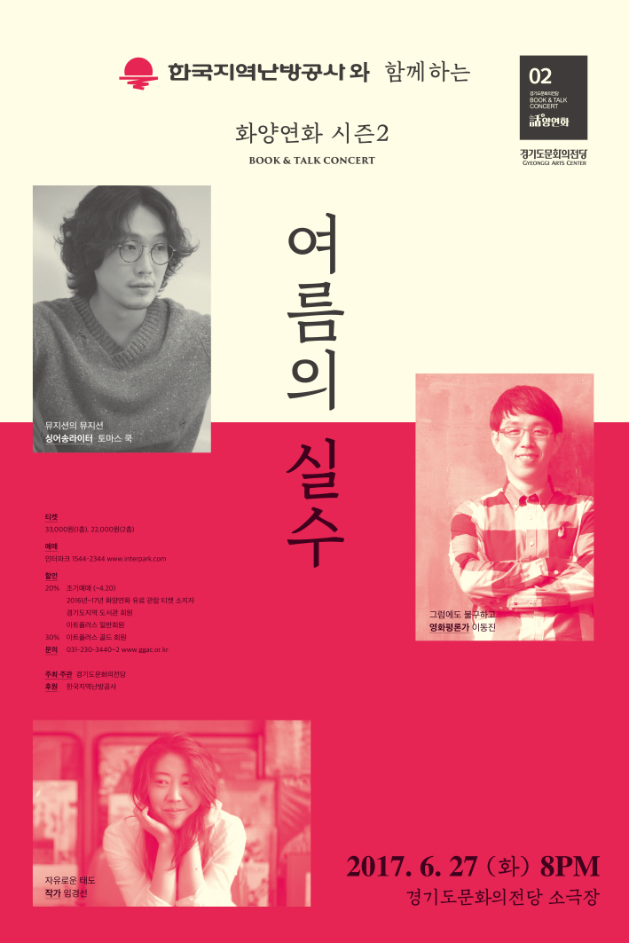 가 '여름의 실수'라는 부제로 오는 6월 27일 경기도문화의전당(사장 정재훈) 소극장으로 찾아온다. 관객들의 취향을 저격하며 호화 라인업으로 주목을 받아 온 는 2017년에 들어 시즌 2로 새롭게 단장하여 관객들과 좀 더 내밀한 대화를 나누고 있다. 총 4회에 걸쳐 진행되는 시즌 2의 첫 공연, '봄의 거짓말'은 지난 3월에 전석 매진을 기록한 바 있다. 본 공연은 출연진이 추천한 주제에 맞는 책을 중심으로 작가와 뮤지션 그리고 관객이 함께 이야기하고 음악을 듣는 형식으로 진행된다. 이번 '여름의 실수' 공연은 팟캐스트 '빨간 책방'과 FM4U '이동진의 푸른 밤' DJ를 하고 있는 영화평론가 이동진이 진행을 맡고 뮤지션의 뮤지션 싱어송라이터 토마스 쿡 그리고 캣우먼으로 잘 알려진 작가 임경선이 함께 한다. 이들은 '실수'라는 주제로 이야기를 나누며 관객들과 소통할 예정이다. 누구나 한 번쯤 저지르는 여러 가지 실수에 대한 이야기는 유쾌하고 소소한 담소로 시작하여 인간의 무의식 속에 존재하는 욕망과 본능에 관한 공감을 나눌 수 있을 것으로 기대된다.
