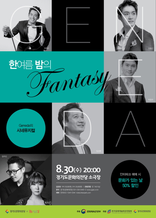 그간 합창, 재즈 등 다양한 장르로 문화가 있는 날을 꾸며왔던 경기도문화의전당은 이번 <한여름 밤의 Fantasy>를 통해 뮤지컬 오페라의 유령 '오페라의 유령(Phantom of Opera)' 등의 뮤지컬 넘버곡들과 영화 라라랜드 '별들의 도시(City of Stars)'를 비롯한 영화 OST를 선보인다. 뮤지컬 배우들이 의기투합한 실력파 4인조 남성 그룹 '제네다(Geneda)'가 한편의 드라마 같은 공연으로 여름 밤을 가득 메울 준비를 하고 있다. 게스트로 뮤지컬 배우 홍금단, 실력파 피아니스트 주빈(Zubin)이 함께한다.