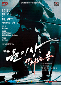 공 연 명 윤이상 탄생 100주년 기념 창작극 연극<윤이상; 상처입은 용> 일 시 2017.10.21(토)~ 10.29(일) / 평일 20시, 토 15시 19시, 일 15시 장 소 대학로예술극장 대극장 공연시간 100분 내외 예술단장 윤봉구 프로듀서 정길배 협력연출 남궁련 예술감독 양정웅 연출 이대웅 작가 이오진 주요스텝 무대디자인 : 이윤수 / 음악감독 : 허안 / 의상 : 이명아 / 분장 : 전주영 기술감독 무대감독 : 이경원 / 조명감독 : 탁형선 / 음향감독 : 구종회 기획 경기도립극단 기획실 기획실장 장운섭 / 기획 PD 이수민, 노은영, 김미애 관람연령 중학생 이상(만13세이상) - 중학생 미만의 경우 입장 불가 티켓가격 R석 3만원, S석 2만원 할 인 율