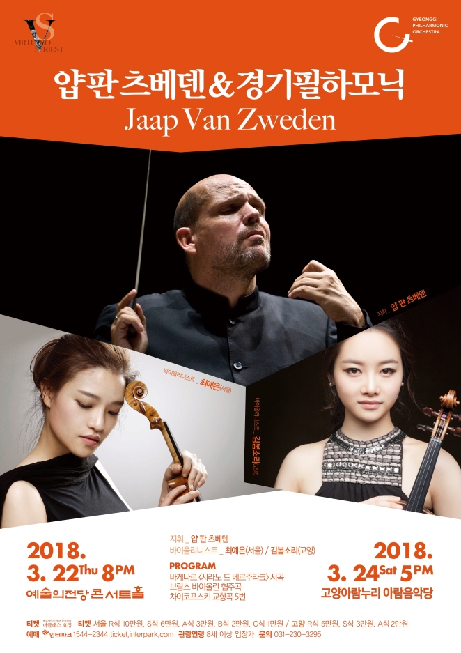 젊은 비르투오소 최예은, 김봄소리가 브람스 협주곡 협연2018년 경기필하모닉 오케스트라가 '비르투오소 시리즈'를 새롭게 시작한다. 총 6번에 걸친 비르투오소 시리즈에서 세계적인 거장들을 만날 수 있다. 얍 판 츠베덴, 니콜라이 즈나이더, 리오 샴바달, 마시모 자네티, 다니엘레 가티 등 세계 최정상 지휘자들이 경기필과 함께 한다.