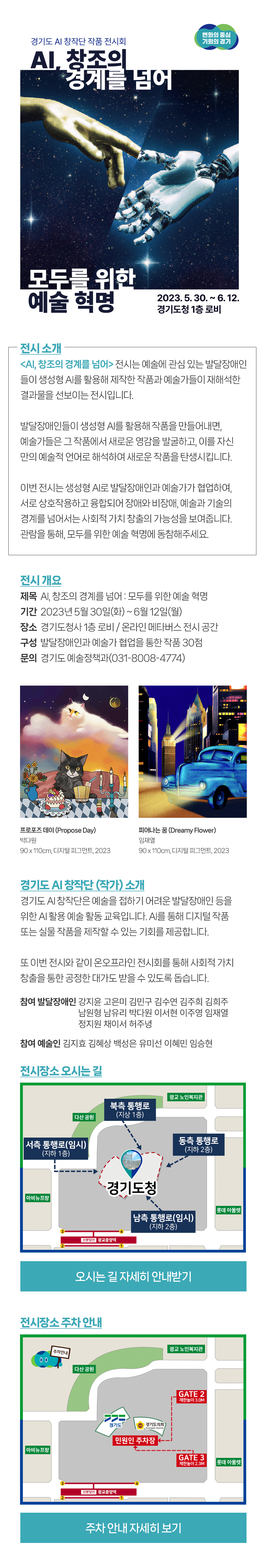기관소식 사업공고 입찰공고 보도자료 예술과만남 경기소식 [경기소식] 경기도 AI 창작단 작품전시회 <AI, 창조의 경계를 넘어> 관리자 2023-06-02 13:00 (수정일: 2023-06-07 10:52) 조회수 600 [경기소식] 2023 경기도 청년 복지포인트 목록 2023년 제1차 경기도 청년면접수당 모집