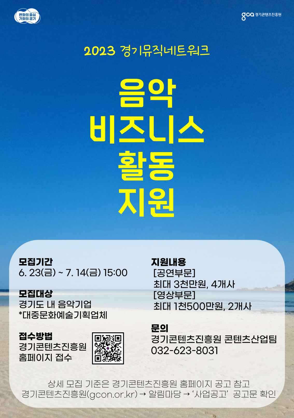 기관소식 사업공고 입찰공고 보도자료 예술과만남 경기소식 2023 경기뮤직네트워크-음악비즈니스활동 지원 모집 관리자 2023-07-06 13:00 조회수 419 [경기소식]경기 청년 활동 지원사업 목록 [경기소식] 2023년 하반기 경기도 대학생 학자금 대출이자 지원