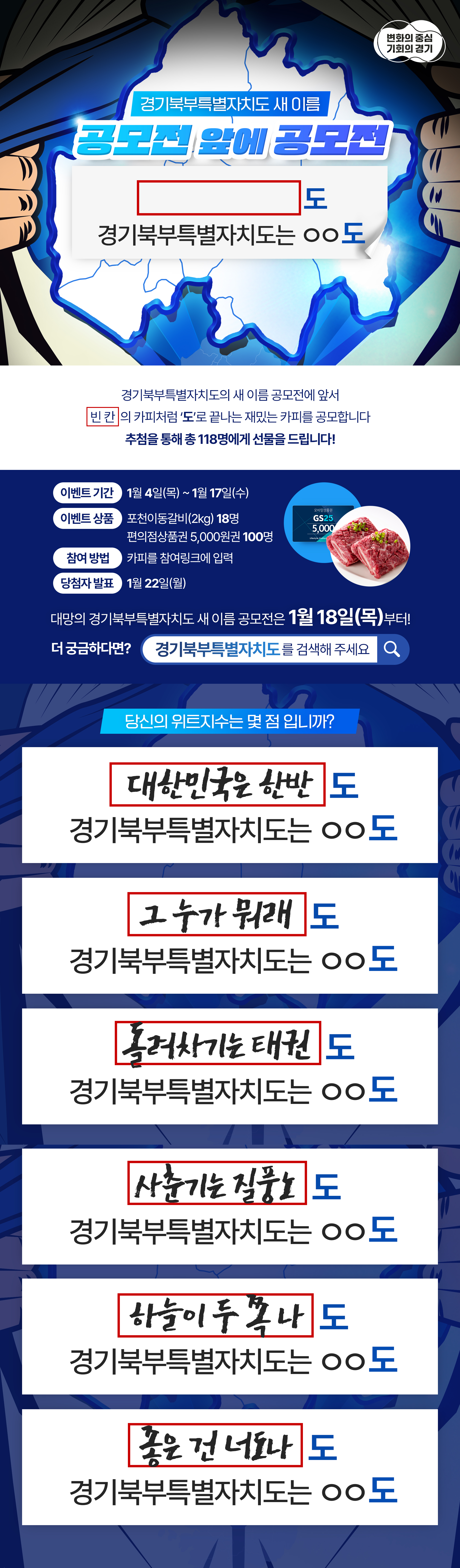 기관소식 사업공고 입찰공고 보도자료 예술과만남 경기소식 [경기소식] 경기북부특별자치도 새이름 공모전 앞에 공모전 관리자 2024-01-09 11:00 (수정일: 2024-01-09 13:44) 조회수 544 [경기소식] 경기북부특별자치도 새이름 공모전 목록 [경기소식] 기후 위기를 성장 기회로!「경기RE100」