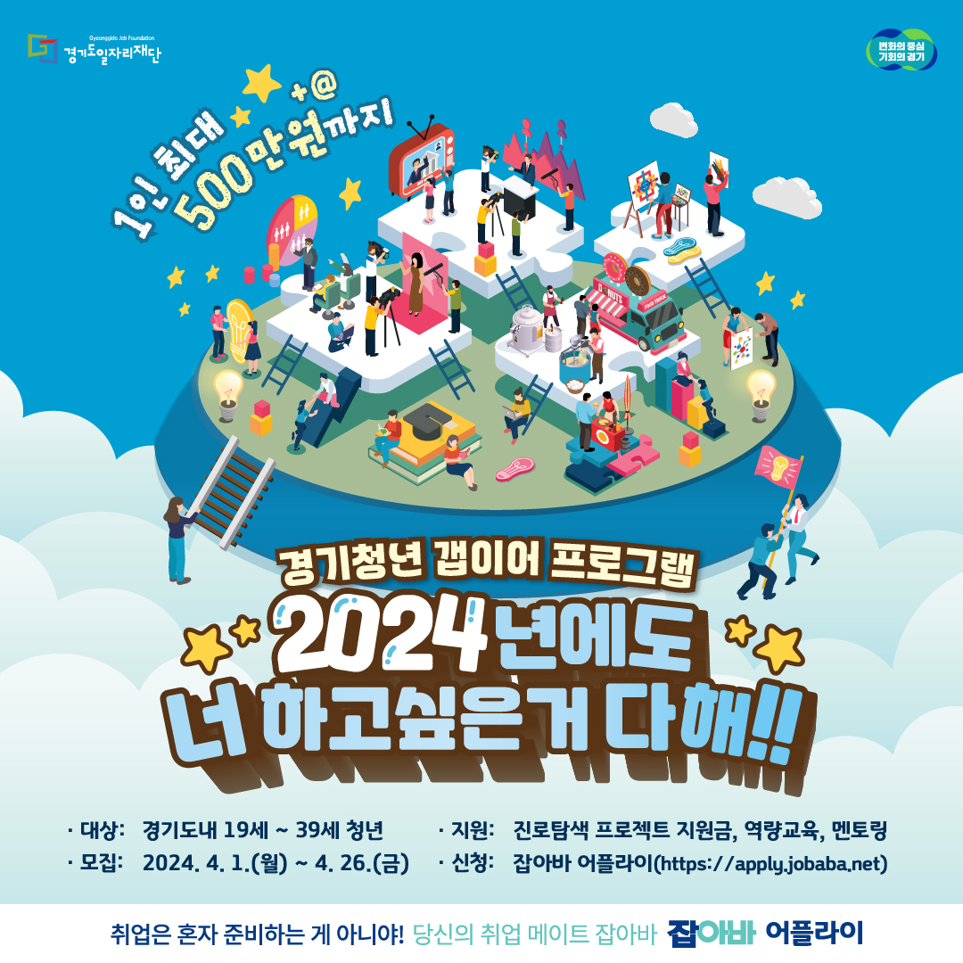 기관소식 사업공고 입찰공고 보도자료 예술과만남 경기소식 [경기소식] 2024년 경기청년 갭이어 프로그램 참여자 모집 공고 관리자 2024-04-02 17:00 (수정일: 2024-05-13 14:28) 조회수 482 첨부파일 2024년 경기청년 갭이어 프로그램 참여자 모집 공고문.pdf 미리보기 다운로드 제14회 경기도장애인체육대회·제70회 경기도체육대회 안내 목록 경기테크노파크 디지털전환허브 입주 모집