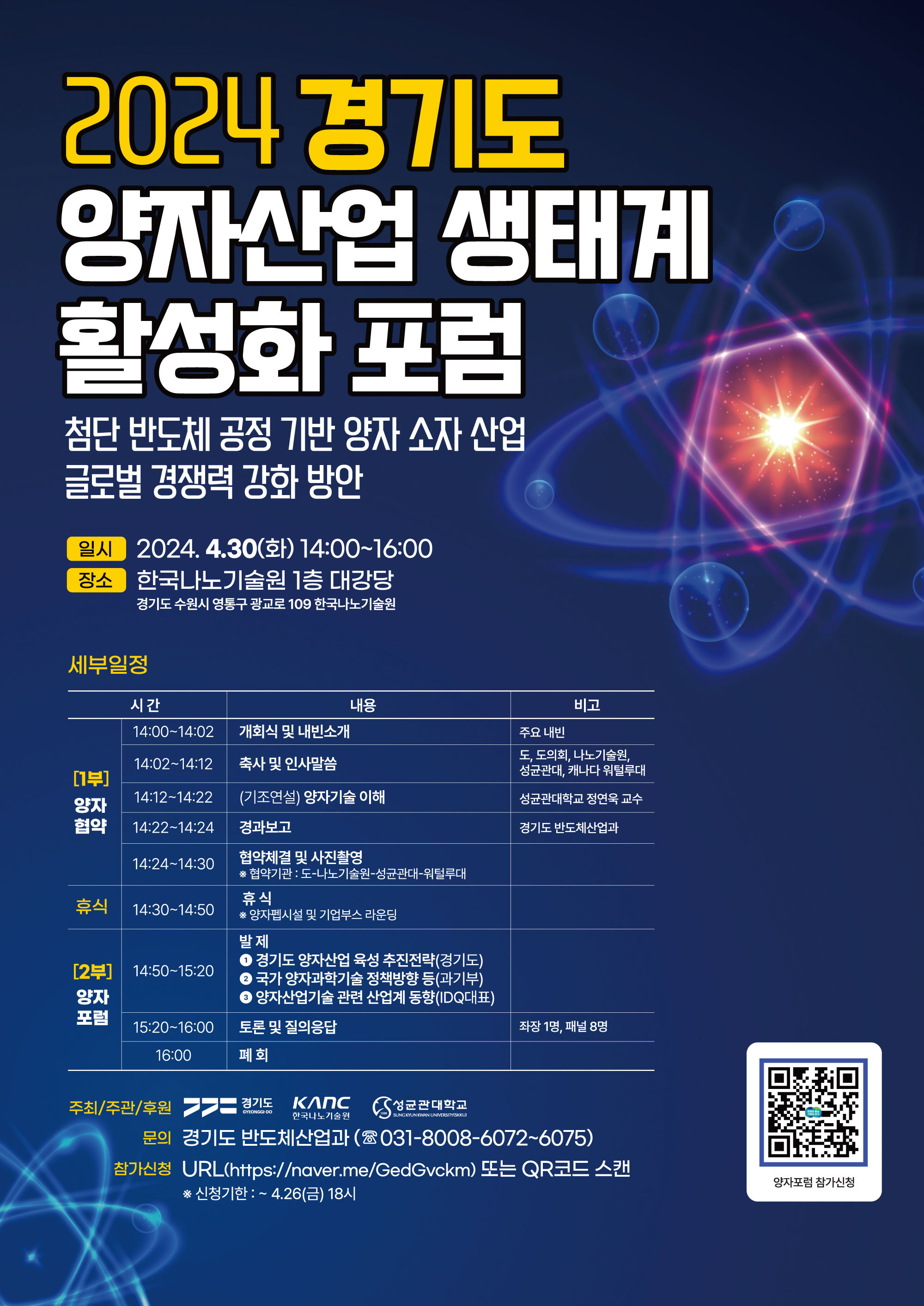 기관소식 사업공고 입찰공고 보도자료 예술과만남 경기소식 2024 경기도 양자산업 생태계 활성화 포럼 관리자 2024-04-23 15:00 (수정일: 2024-04-25 13:25) 조회수 367 ○ 행 사 명 : "2024 경기도 양자산업 생태계 활성화 포럼" ○ 일시/장소 : 2024.4.30.(화) 14:00~16:00, 한국나노기술원 1층 대강당 [경기RE100] 우리의 선택 RE100 온라인 캠페인 목록 경기청년역량강화 기회 지원 사업