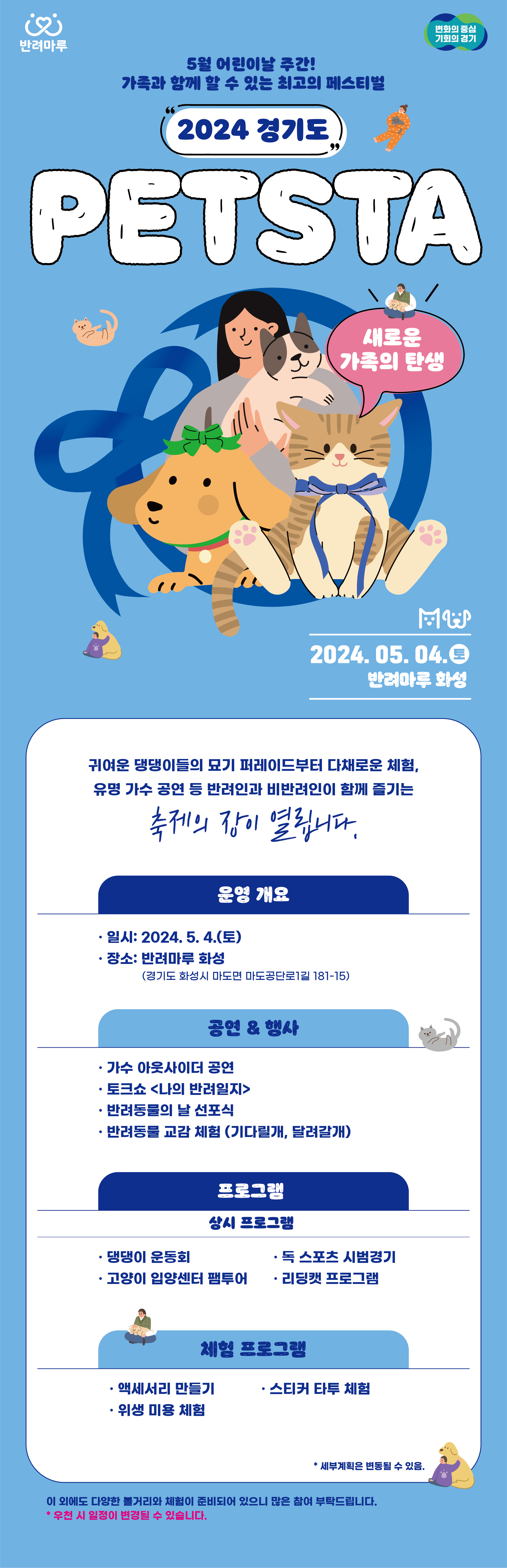 경기도에서는 반려동물과 함께하는 문화조성 및 입양활성화를 위해「새로운 가족의 탄생, 2024 경기도 PETSTA」행사를 아래와 같이 개최합니다