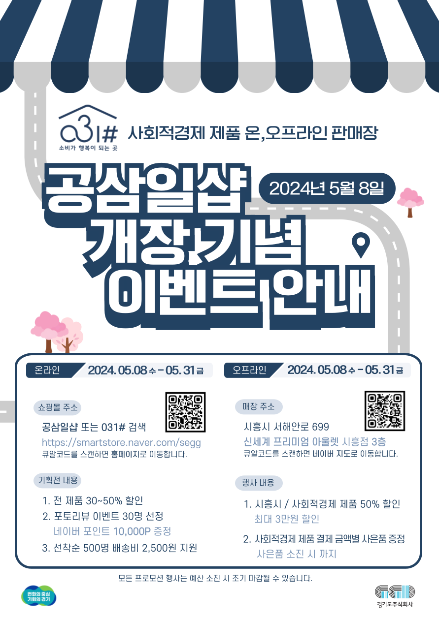 기관소식 사업공고 입찰공고 보도자료 예술과만남 경기소식 경기도 사회적경제 제품 판매장 공삼일샵 개장기념 행사 관리자 2024-05-07 14:00 조회수 413 [경기소식] 2024년 「경기청년 해외 취창업 기회 확충」 참여자 모집안내 목록 2024년 소상공인 재창업 지원사업 모집