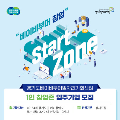기관소식 사업공고 입찰공고 보도자료 예술과만남 경기소식 경기도 베이비부머 1인 창업존(start zone) 지원사업 안내 관리자 2024-06-28 09:00 (수정일: 2024-06-27 18:00) 조회수 465 ○ 지원사업: 경기도 베이비부머 1인 창업존(start zone) ○ 지원대상: 경기도 40~64세 베이비부머 예비(초기)창업자 ○ 지원혜택: 사업자등록증 주소지, 창업공간(1인지정석), 창업교육, 멘토링 무료제공 ○ 신청기간: 상시모집 ○ 지원주소: https://buly.kr/7x4SWYm 부천영상 청년예술인주택 추가모집(3차)안내 목록 2024년「경기도 예술인 기회소득」 사업 안내