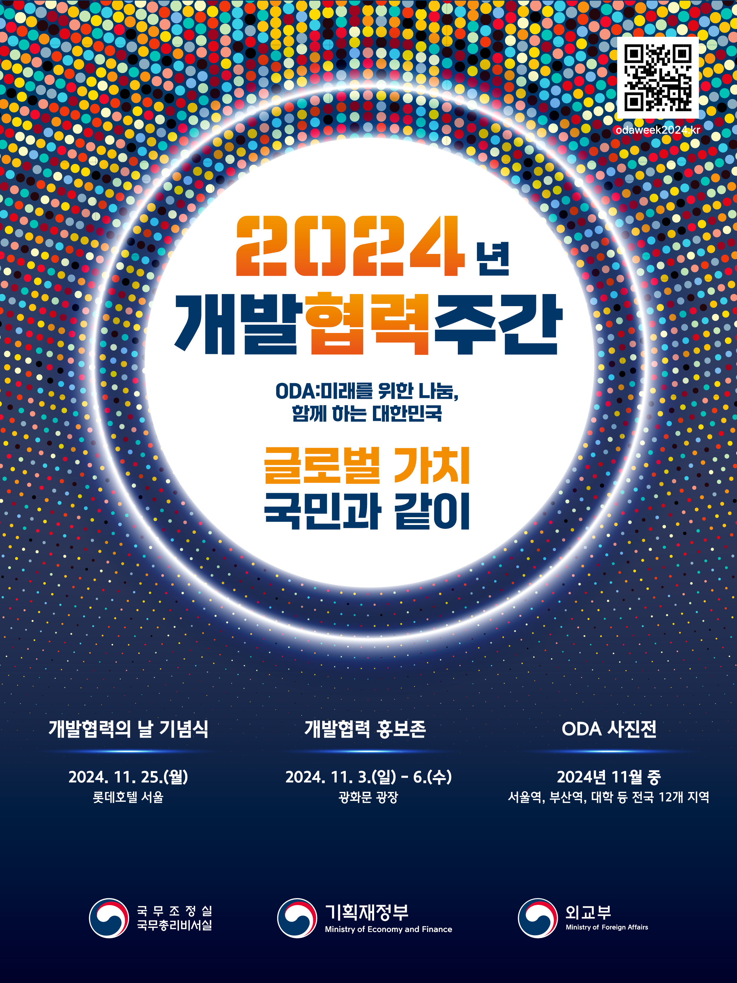 기관소식 사업공고 입찰공고 보도자료 예술과만남 경기소식 경기도 개발협력주간 및 사전행사 안내 관리자 2024-10-30 14:00 (수정일: 2024-10-30 15:26) 조회수 540 □ 개요 ○ 행사명: 2024년 개발협력주간 ○ 기간: 2024.11.25(월)~29(금) ○ 문의: 070-8854-1878 ※ 사전행사: 11.3(일)~11.6(수) 개발협력 홍보존 및 사진전 또한 운영예정이니 많은 관심 부탁드립니다. 경기도「The 경기패스」100만 돌파 안내 목록 「2024 DMZ OPEN 국제음악제」안내