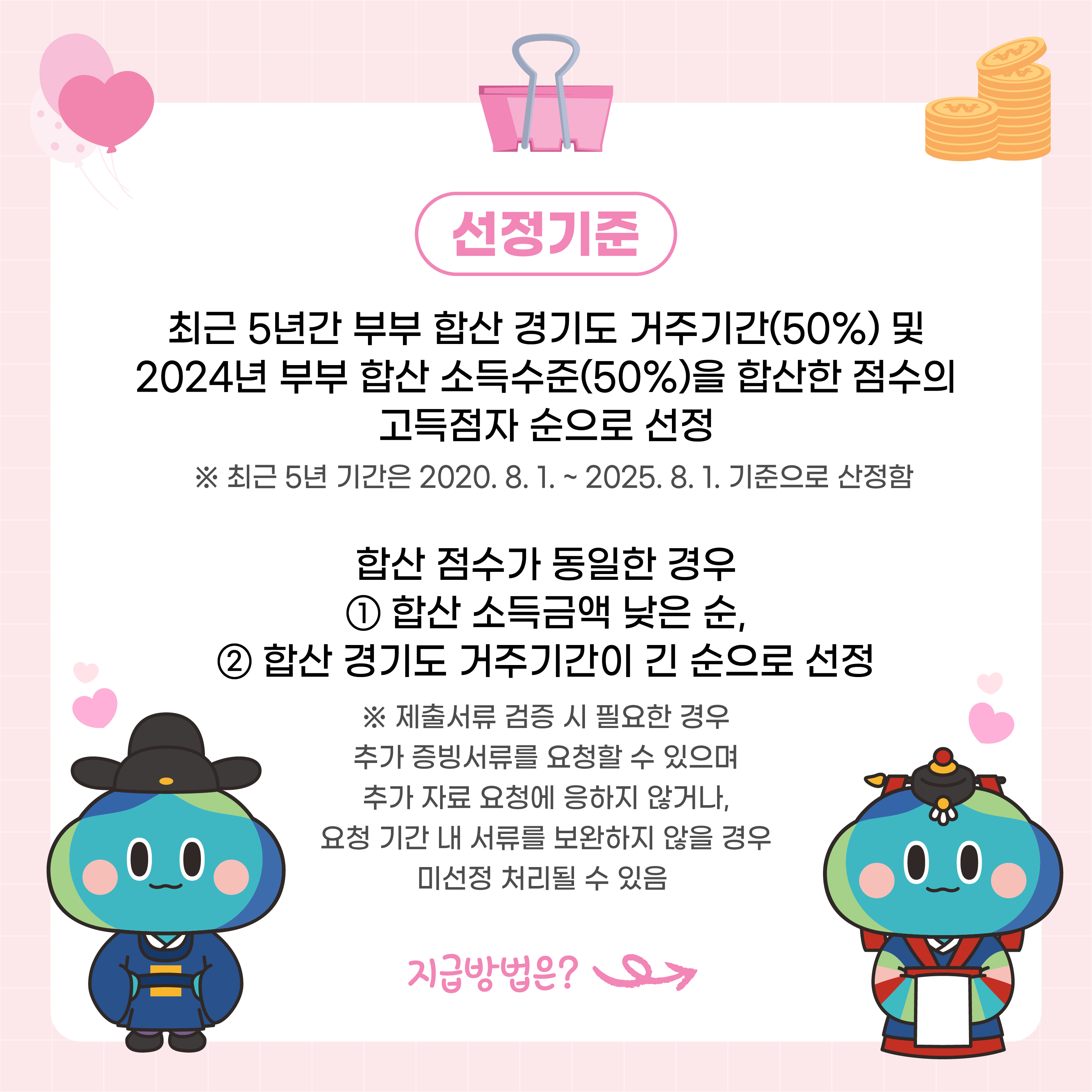 마. 선정기준 : 최근 5년간 부부 합산 경기도 거주기간(50%) 및 2024년 부부 합산 소득수준(50%)을 합산한 점수의 고득점자 순으로 선정