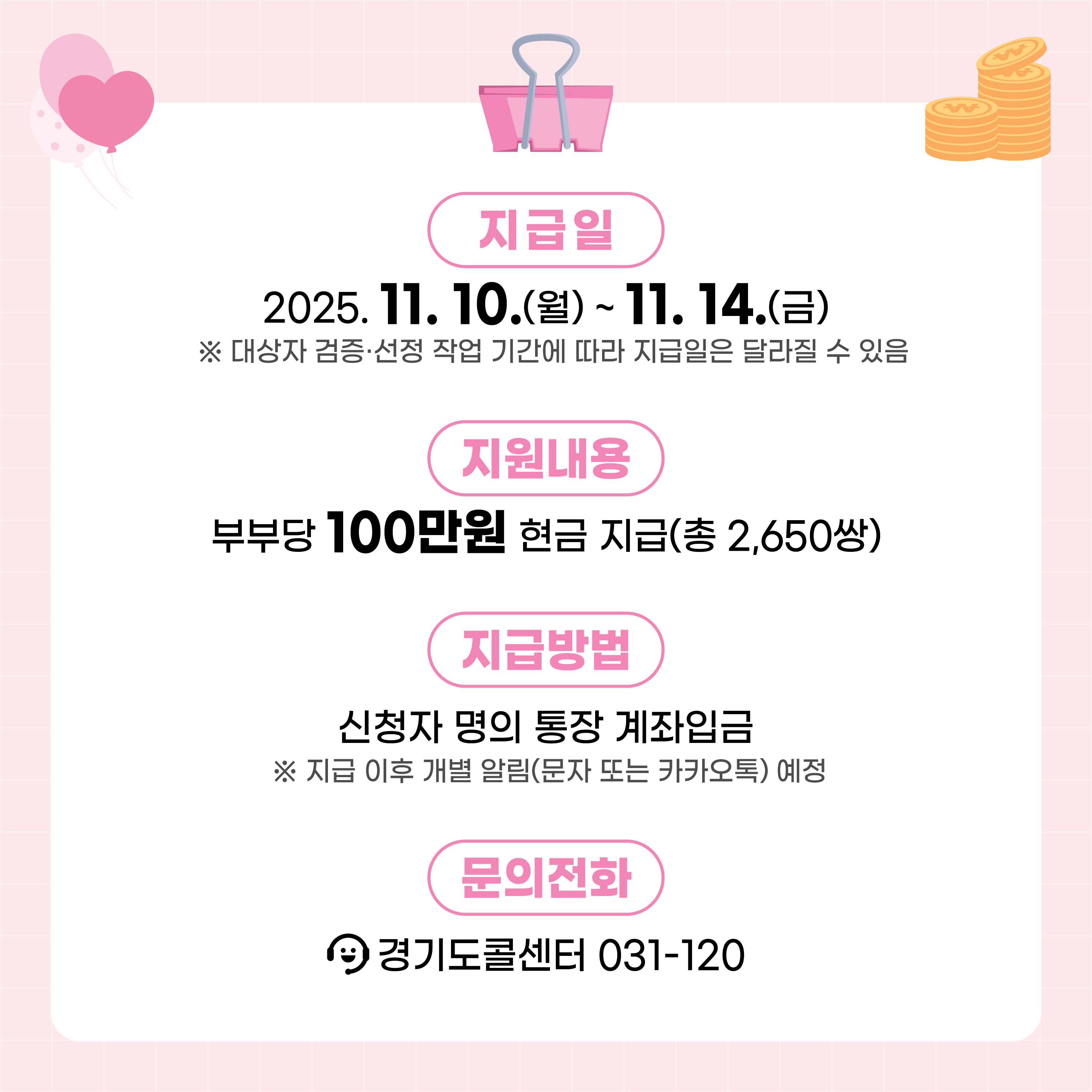 다. 지원인원 및 내용 : 총 2,650쌍, 부부당 100만원 현금 지급