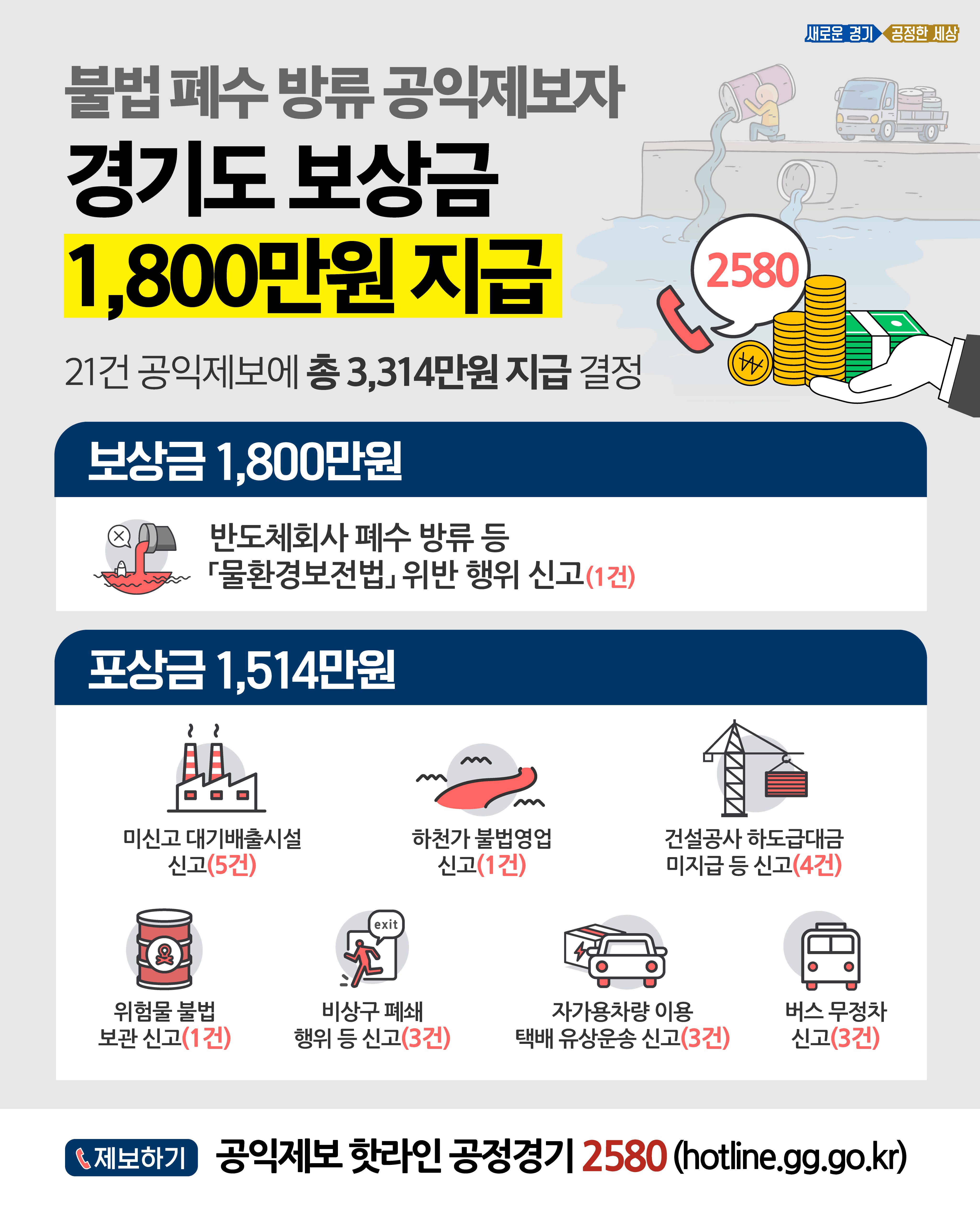 경기도가 불법 폐수 방류를 제보한 공익제보자에게 보상금 1,800만 원을 지급하기로 했다. 이는 지난해 처음으로 4,235만 원의 보상금을 지급한 이후 두 번째 사례다.