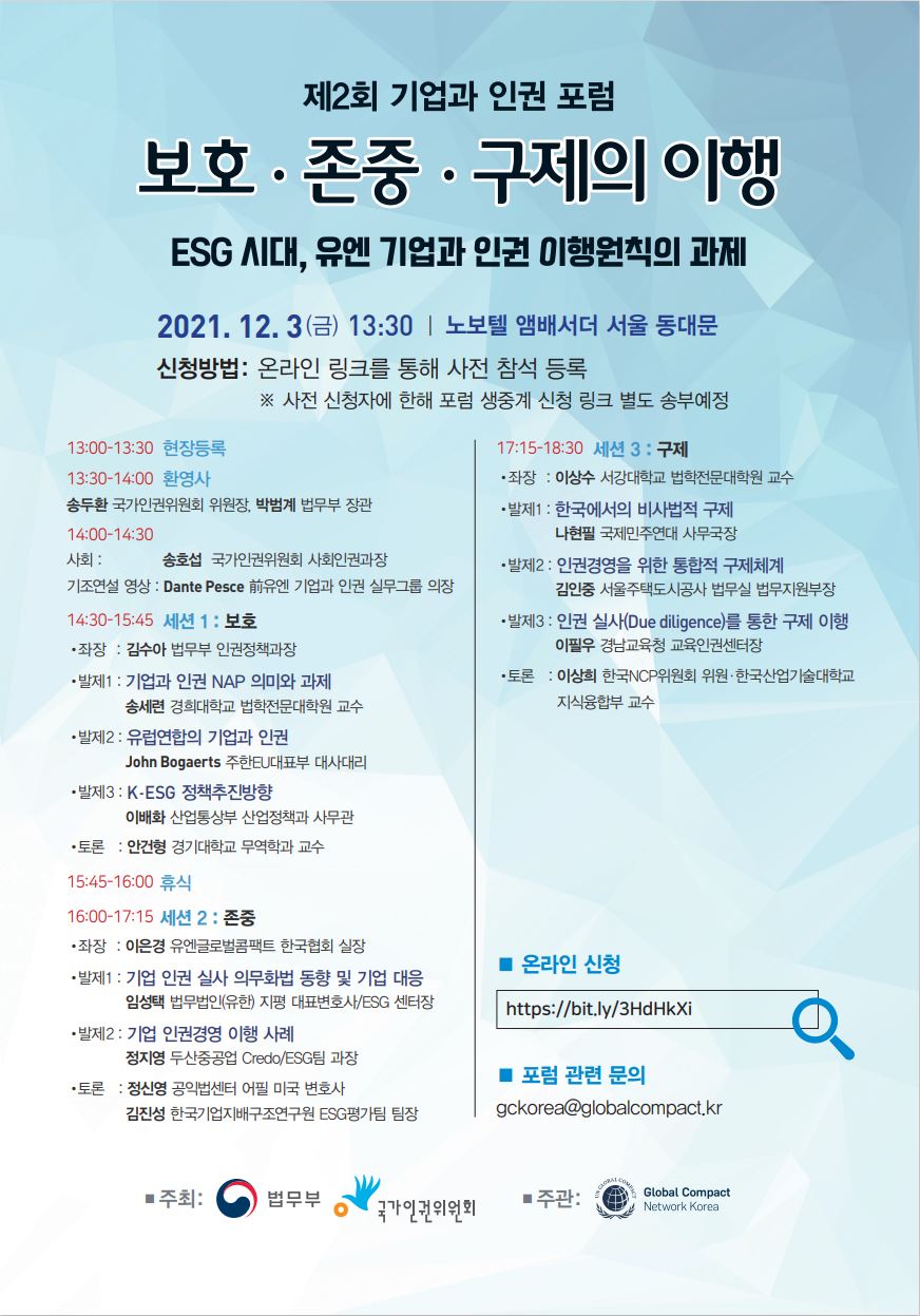 윤리경영 인권경영 ESG경영 공정거래 인권경영 헌장 인권경영 게시판 2021년 제2회 기업과 인권 포럼 안내 감사팀 2021-12-01 09:00 (수정일: 2023-01-18 09:50) 조회수 216 2022년 경기도 인권센터 안내 목록 2021년 경기도 인권포럼 안내