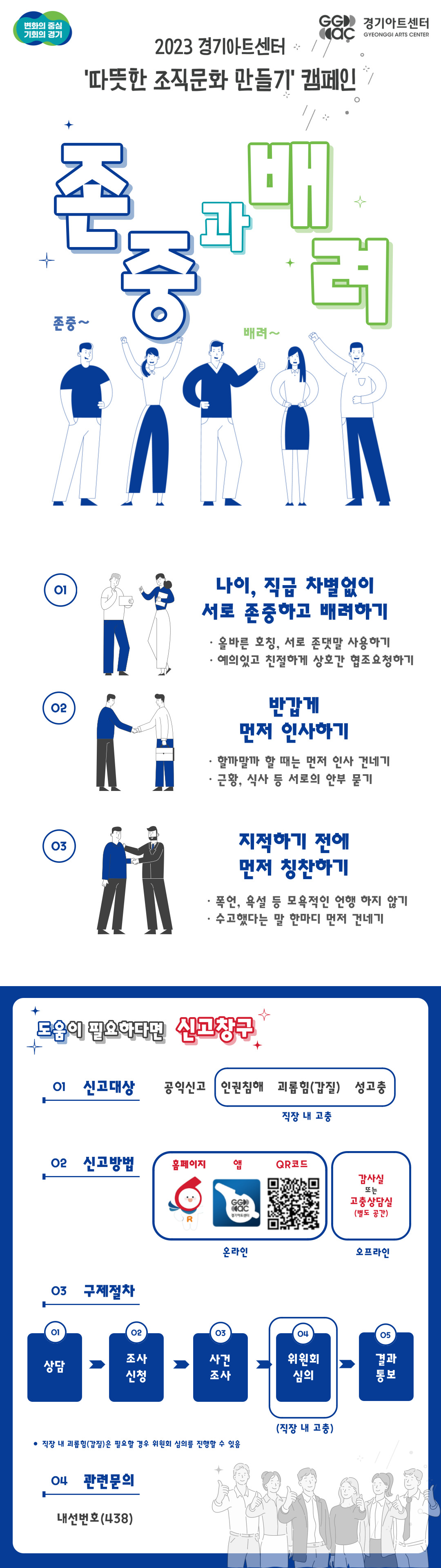 윤리경영 인권경영 ESG경영 공정거래 인권경영 헌장 인권경영 게시판 2023년 경기아트센터 <따뜻한 조직문화 만들기> 캠페인 감사팀 2023-12-29 10:00 조회수 190 2023년 경기아트센터 인권경영보고서 목록 경기아트센터 인권경영 헌장 개정(2023. 12. 14.)