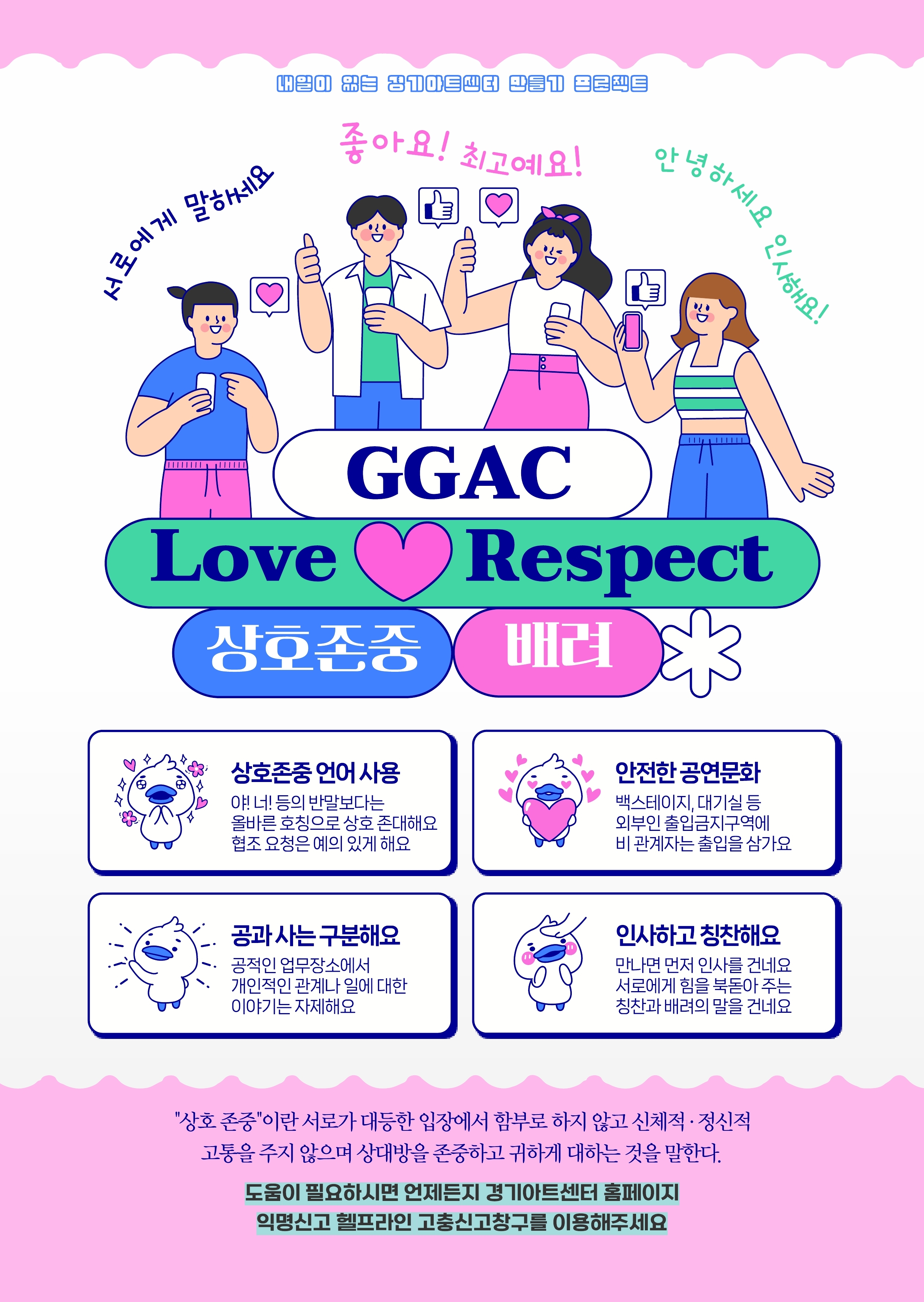 윤리경영 인권경영 ESG경영 공정거래 인권경영 헌장 인권경영 게시판 2024년 경기아트센터 상호존중 캠페인 감사실 2025-03-10 17:00 (수정일: 2025-03-10 17:21) 조회수 106 2024년 경기아트센터 상호존중 캠페인 포스터를 공유드립니다. 첨부파일 GGAC 상호존중 캠페인.pdf 미리보기 다운로드 이전 게시글이 없습니다. 목록 2024년 경기아트센터 인권경영보고서