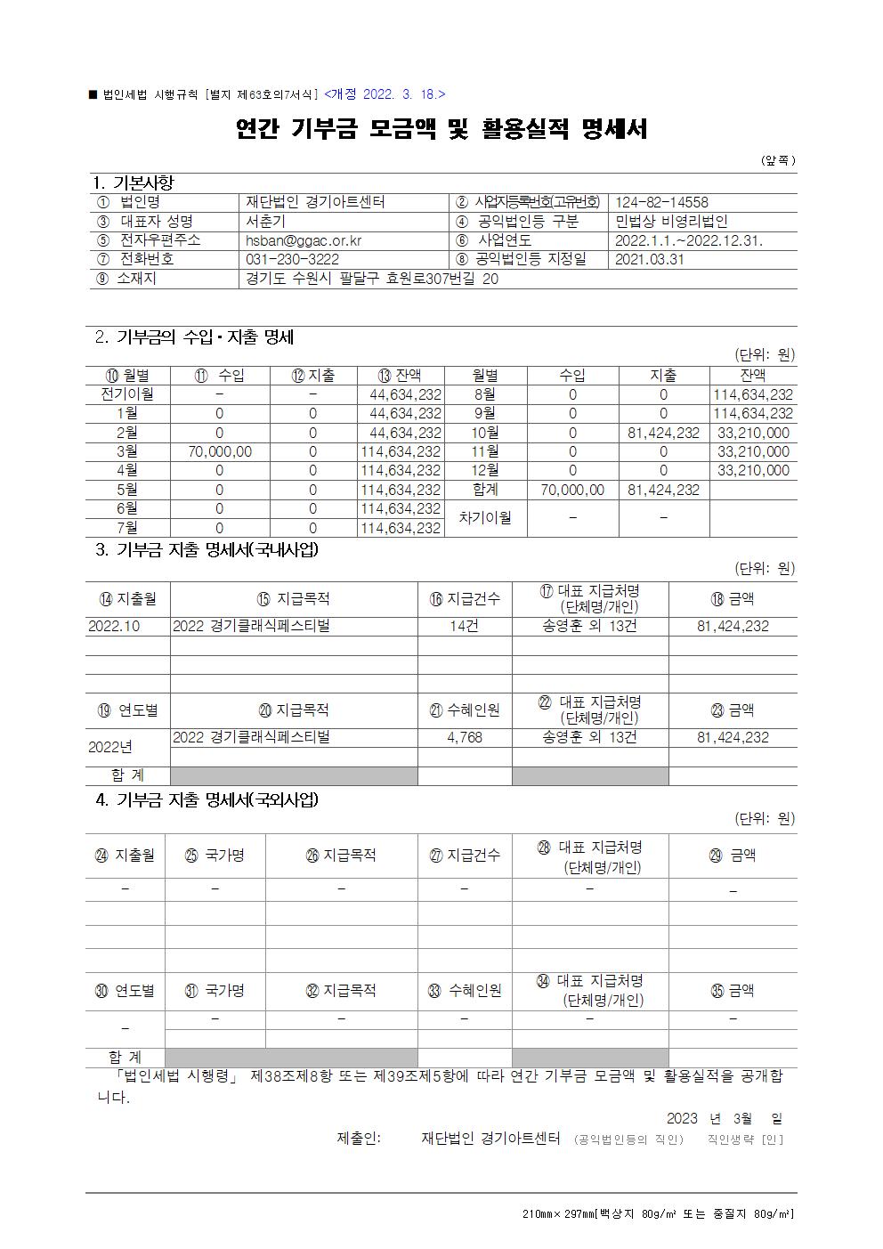 사전정보공표 경영공시 공공데이터 행정정보공개 경영공시 일반현황 재산현황 예산현황 감사현황 경영성과 계약현황 2022 연간기부금모금액 및 활용실적 명세서 경영기획팀 2023-03-11 16:00 조회수 244