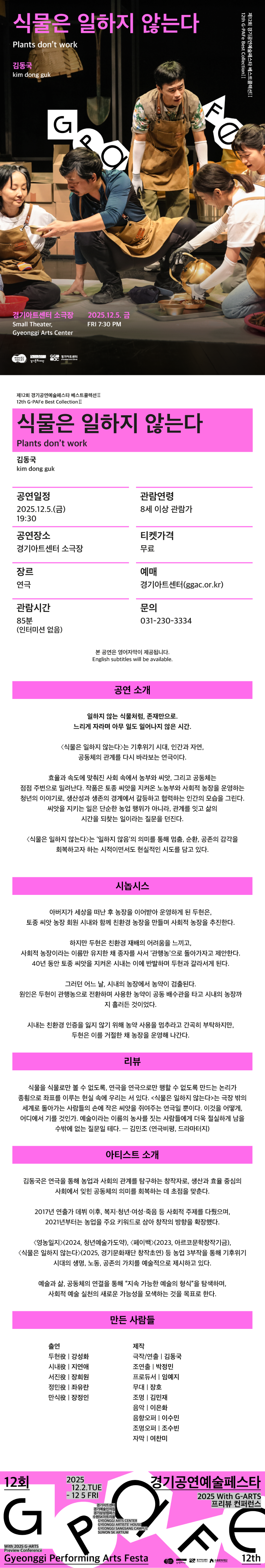 일정별 공연장별 예술단별 월간일정 전체 대극장 소극장 국악당 갤러리 기타 기획공연 [제12회 경기공연예술페스타 베스트콜렉션Ⅱ]식물은 일하지 않는다 일자 2025-12-05 (금) ~ 2025-12-05 (금) 시간 2025-12-05 19:30 (공연시간: 85분) 장소 소극장 주최/주관 경기문화재단 / 경기문화재단, 경기아트센터 관람연령 8세 이상 문의 031-230-3334 공유 공유하기 티켓가격 전석 무료 예매하기 상세정보 티켓정보 유의사항 리뷰 상세정보 티켓정보 유의사항 *2025. 11. 27.(목) 10시 티켓 오픈 예정입니다. 리뷰 아직 작성된 리뷰가 없습니다. 첫 리뷰 글을 작성해 보세요. 목록보기