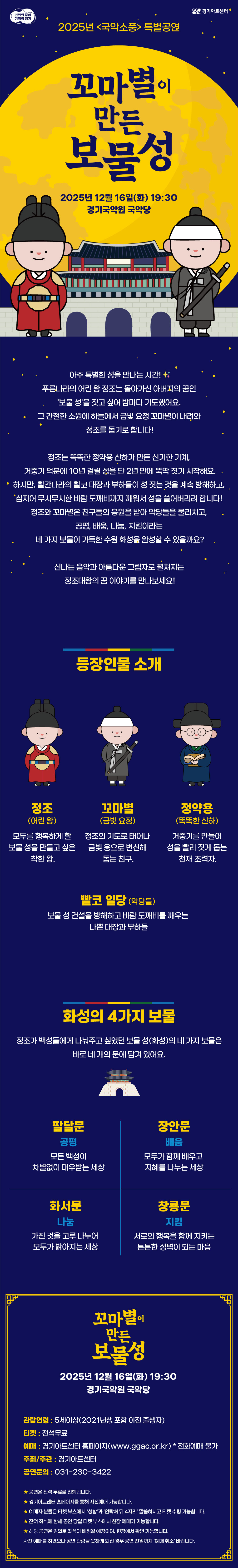 일정별 월간일정 기획공연 2025년 <국악소풍> 특별공연 - 꼬마별이 만든 보물성 일자 2025-12-16 (화) ~ 2025-12-16 (화) 시간 2025-12-16 19:30 (공연시간: 50분) 장소 국악당(용인) 주최/주관 경기아트센터, 경기국악원 / 경기아트센터,경기국악원 관람연령 5세 이상(21년생 포함) 문의 031-289-6422 공유 공유하기 티켓가격 전석무료 예매하기 상세정보 티켓정보 유의사항 리뷰 상세정보 티켓정보 유의사항 리뷰 아직 작성된 리뷰가 없습니다. 첫 리뷰 글을 작성해 보세요. 목록보기