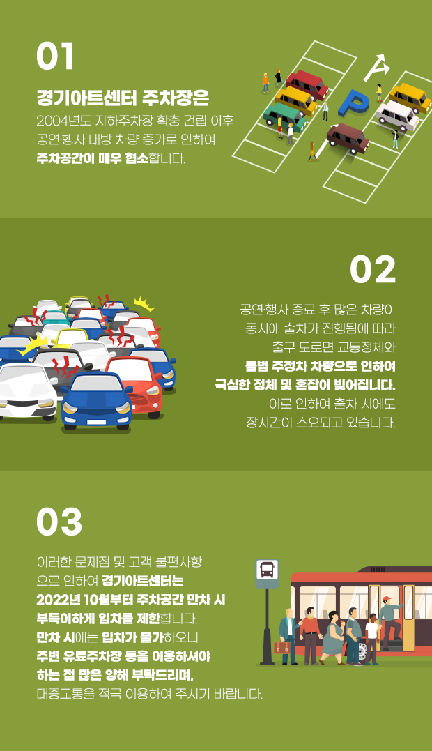 - 경기아트센터 주차장은 2004년도 지하주차장 확충 건립 이후 공연·행사 내방 차량 증가로 인하여 주차공간이 매우 협소합니다.