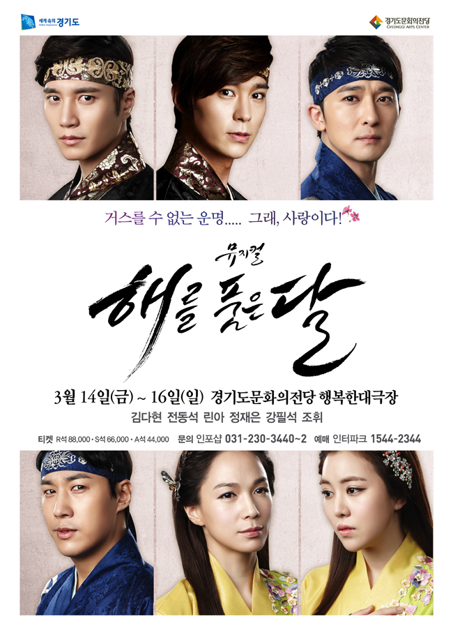 세계속의 경기도와 경기도문화의전당 진행.(해를 품은 달 주인공 3명의 사진)거스를 수 없는 운명…..그래, 사랑이다!뮤지컬 해를 품은 달3월 14일(금)~16일(일) 경기도문화의전당 행복한대극장김다현, 전동석, 린아, 정재은, 강필석, 조휘 출연티켓 R석 88,000원, S석 66,000원, A석 44,000원문의 인포샵 031-230-3440~2예매 인터파크 1544-2344(해를 품은 달 주인공 3명의 사진)