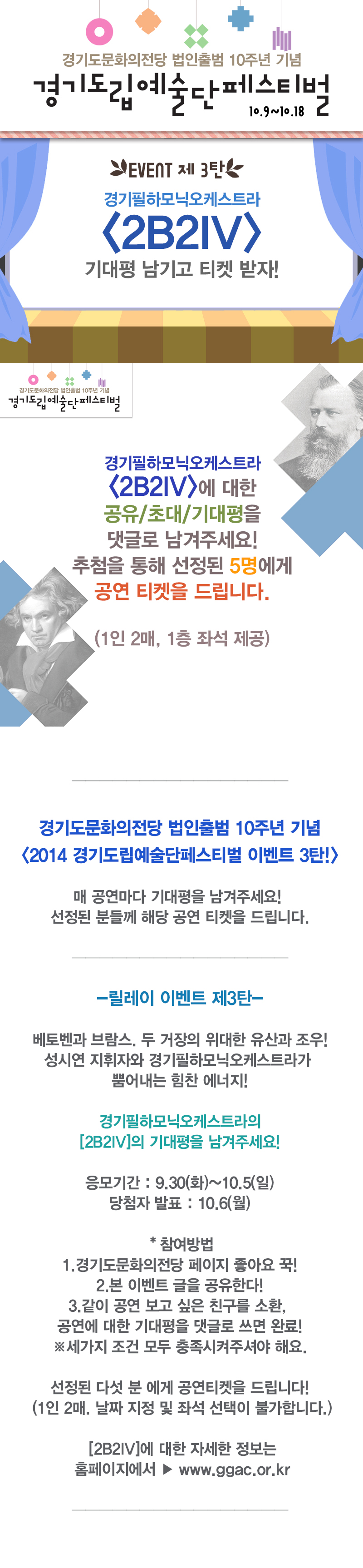 경기도문화의전당 법인출범 10주년 기념 경기도립예술단페스티벌 10.9~10.18EVENT 제 3탄 경기필하모닉오케스트라 2B2Ⅳ 기대평 남기고 티켓받자! (경기도문화의전당 법인출범 10주년 기념 경기도립예술단페스티벌 로고이미지),경기필하모닉오케스트라 2B2Ⅳ에 대한 공유/초대/기대평을 댓글로 남겨주세요! 추첨을 통해 선정된 5명에게 공연 티켓을 드립니다. 1인 2매, 1층 좌석 제공. 경기도문화의전당 법인출범 10주년 기념 2014 경기도립예술단페스티벌 이벤트 3탄! 매 공연마다 기대평을 남겨주세요! 선정된 분들께 해당 공연 티켓을 드립니다.릴레이 이벤트 제3탄 베토벤과 브람스. 두 거장의 위대한 유산과 조우! 성시연 지휘자와 경기필하모닉오케스트라가 뿜어내는 힘찬 에너지!경기필하모닉오케스트라의 2B2Ⅳ의 기대평을 남겨주세요!,응모기간 9월 30일 화요일부터 10월 5일 일요일까지,당첨자 발표 10월 6일 월요일,참여방법 1. 경기도문화의전당 페이지 좋아요 꾹! 2. 본 이벤트 글을 공유한다! 3. 같이 공연 보고싶은 친구를 소환, 공연에 대한 기대평을 댓글로 쓰면 완료! 세가지 조건 모두 충족시켜주셔야 해요. 선정된 다섯 분에게 공연 티켓을 드립니다! 1인 2매. 날짜 지정 및 좌석 선택이 불가합니다.2B2Ⅳ에 대한 자세한 정보는 홈페이지에서 www.ggac.or.kr