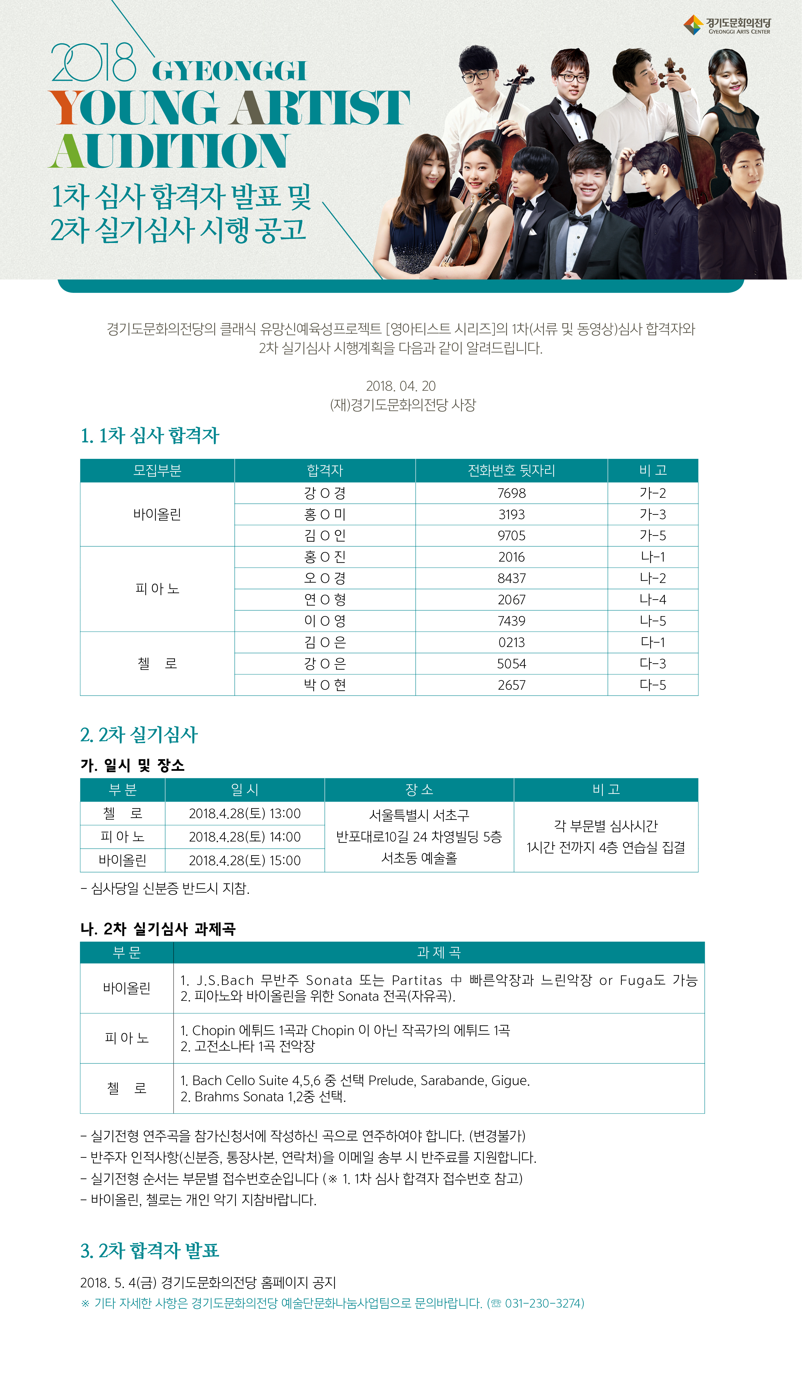 2018 경기 영 아티스트 오디션 1차 심사합격자 발표 및 2자 실기심사 시행공고 관리자 2018-04-19 00:00 (수정일: 2018-04-20 14:22) 조회수 25,006 2018년 상반기 경기도립예술단 단원 모집 서류전형 합격자 및 실기전형 시행계획 공고 목록 (재)경기도문화의전당 공무직 비서직무 근로자 및 육아휴직 대체근로자(기간제) 채용 서류심사 합격자 공고