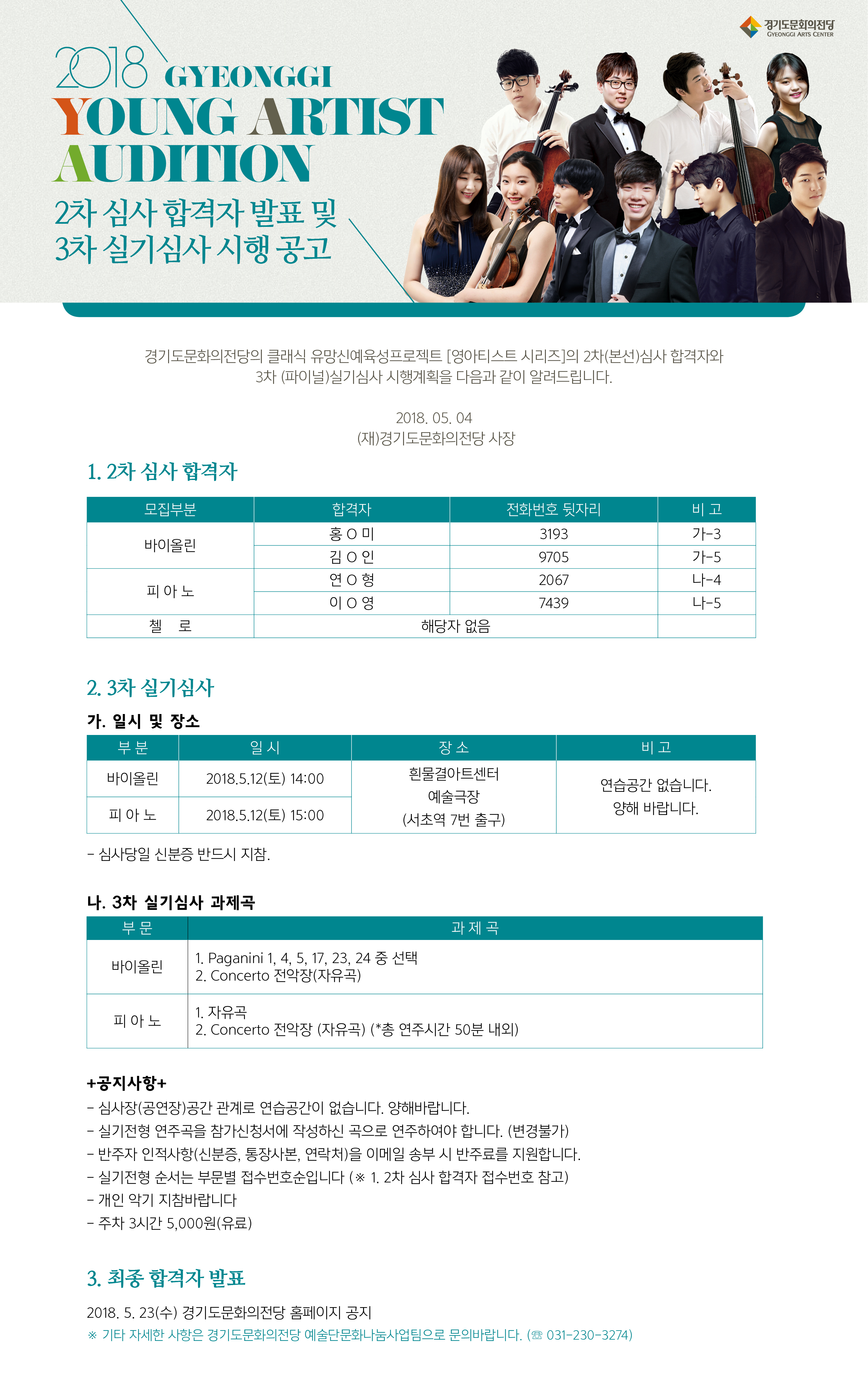 2018경기 영아티스트 오디션 2차 심사 합격자 발표 및 3차 실기심사 시행 공고 관리자 2018-05-04 00:00 (수정일: 2018-05-04 10:02) 조회수 5,276 (재)경기도문화의전당 2018년 공무직 비서직무 근로자 최종합격자 공고 목록 2018년 상반기 경기도립예술단 단원 모집 최종합격자 공고